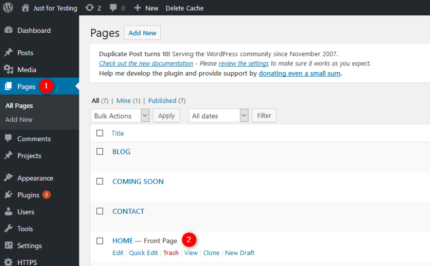 Pour gérer les pages de votre site, cliquez sur Pages (1) depuis le menu principal du tableau de bord de WordPress. La liste des pages de votre site s’affiche et il vous suffit de cliquer sur le titre de la page que vous souhaitez modifier. Dans notre exemple, nous allons cliquer sur HOME (2) comme nous souhaitons modifier la page d’accueil.