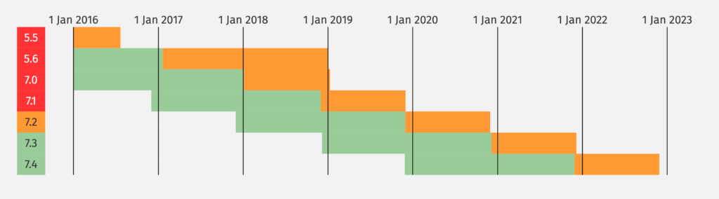 Grün steht für aktiven Support und Orange für Support nur bei kritischen Sicherheits-Problemen. Rot sind jene Versionen, die ihr „End of Life“ bereits erreicht haben und nicht mehr unterstützt werden.