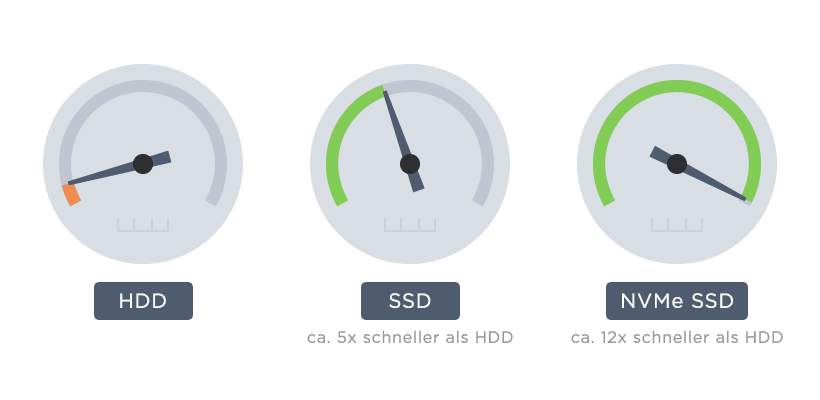 Ihre Website-Daten sind damit viel schneller verfügbar als bei konventionellen Festplatten, welche wir bei der alten Servergeneration eingesetzt haben. Die Lesezeiten der SSDs sind rund 5 Mal und die der NVMe-Disks 12 Mal schneller als bei herkömmlichen Festplatten. Zudem sind die Zugriffszeiten 20 bis 150 Mal kürzer.